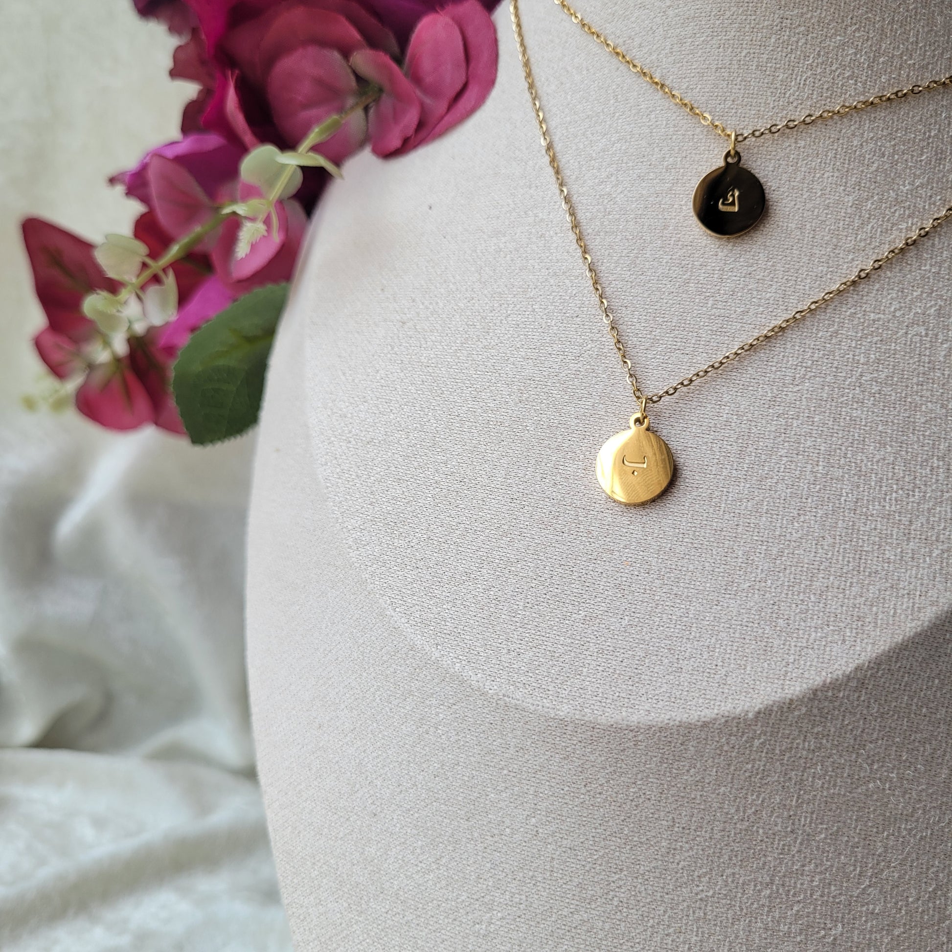 Beautiful arabic initials on a dainty 12mm stainless steel coin and plated in 18k gold ✨️