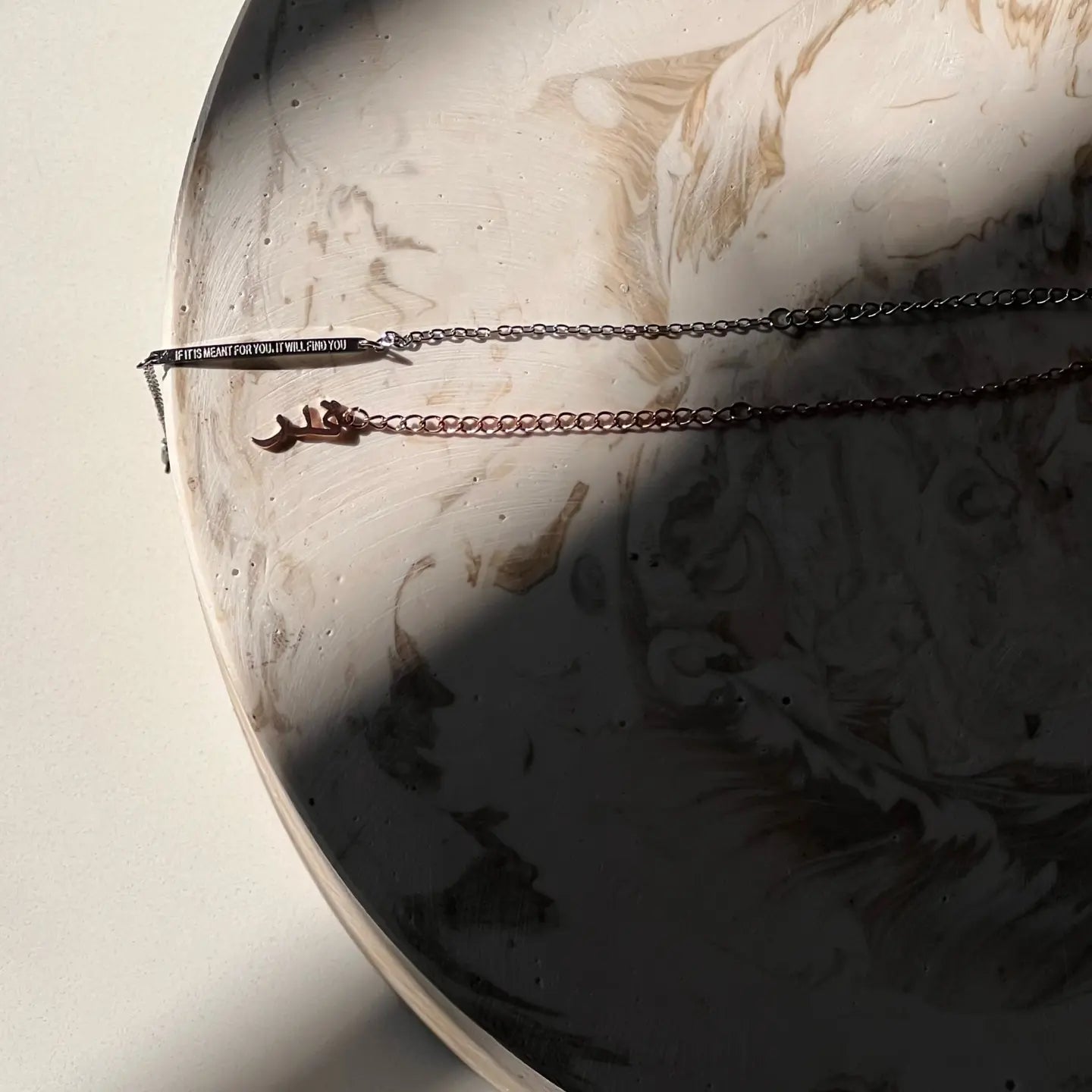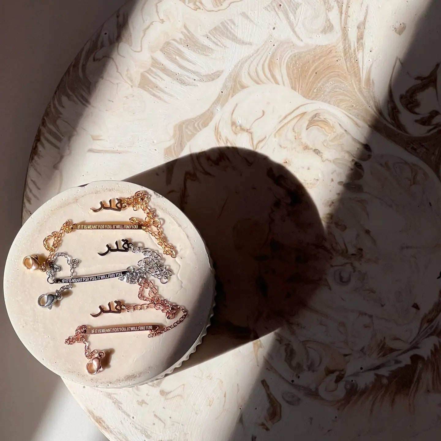 This beautiful bracelet is inscribed with a reminder that what is meant for you will find you. At the end of the extension hangs a dainty (قدر) charm.